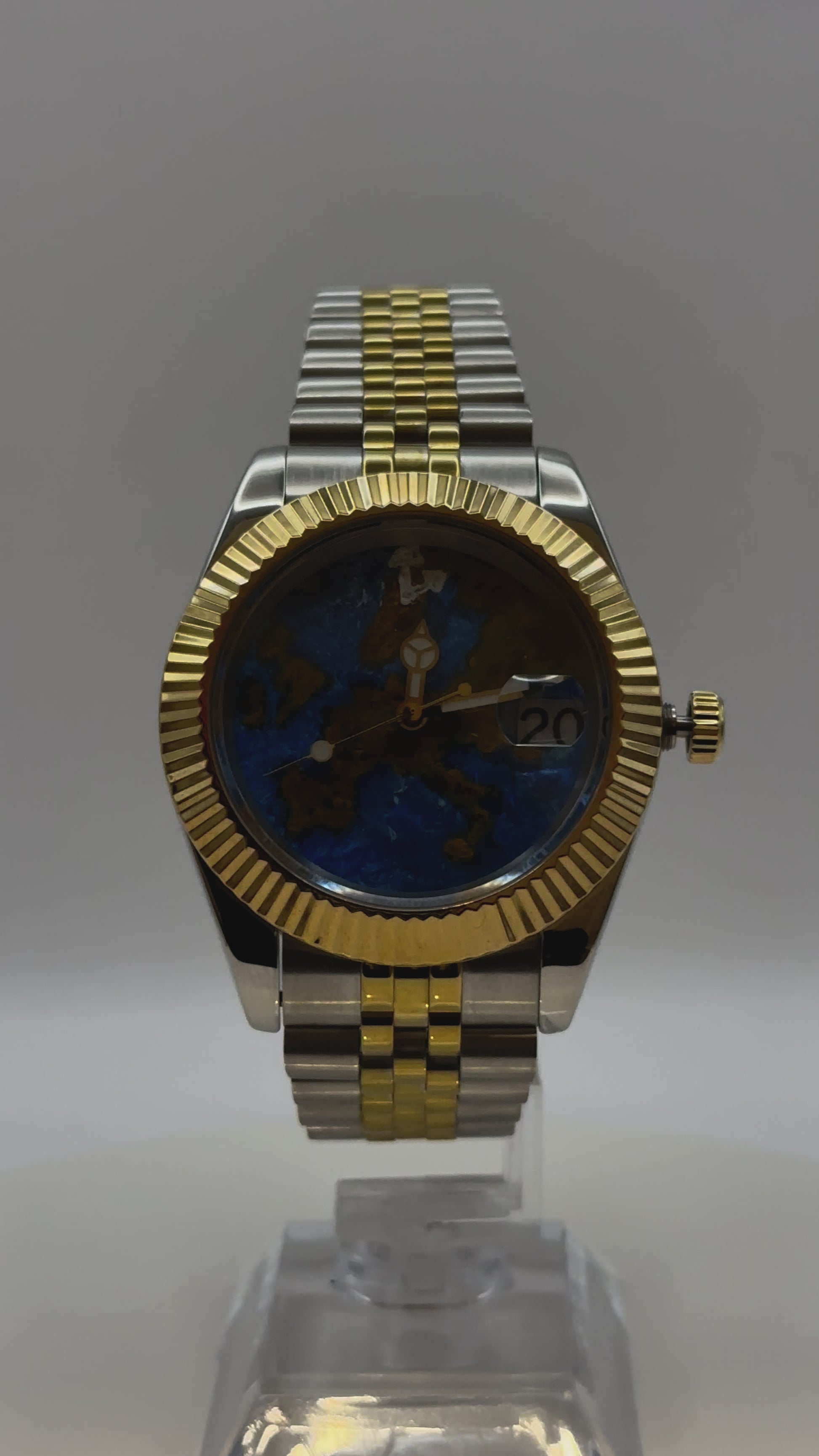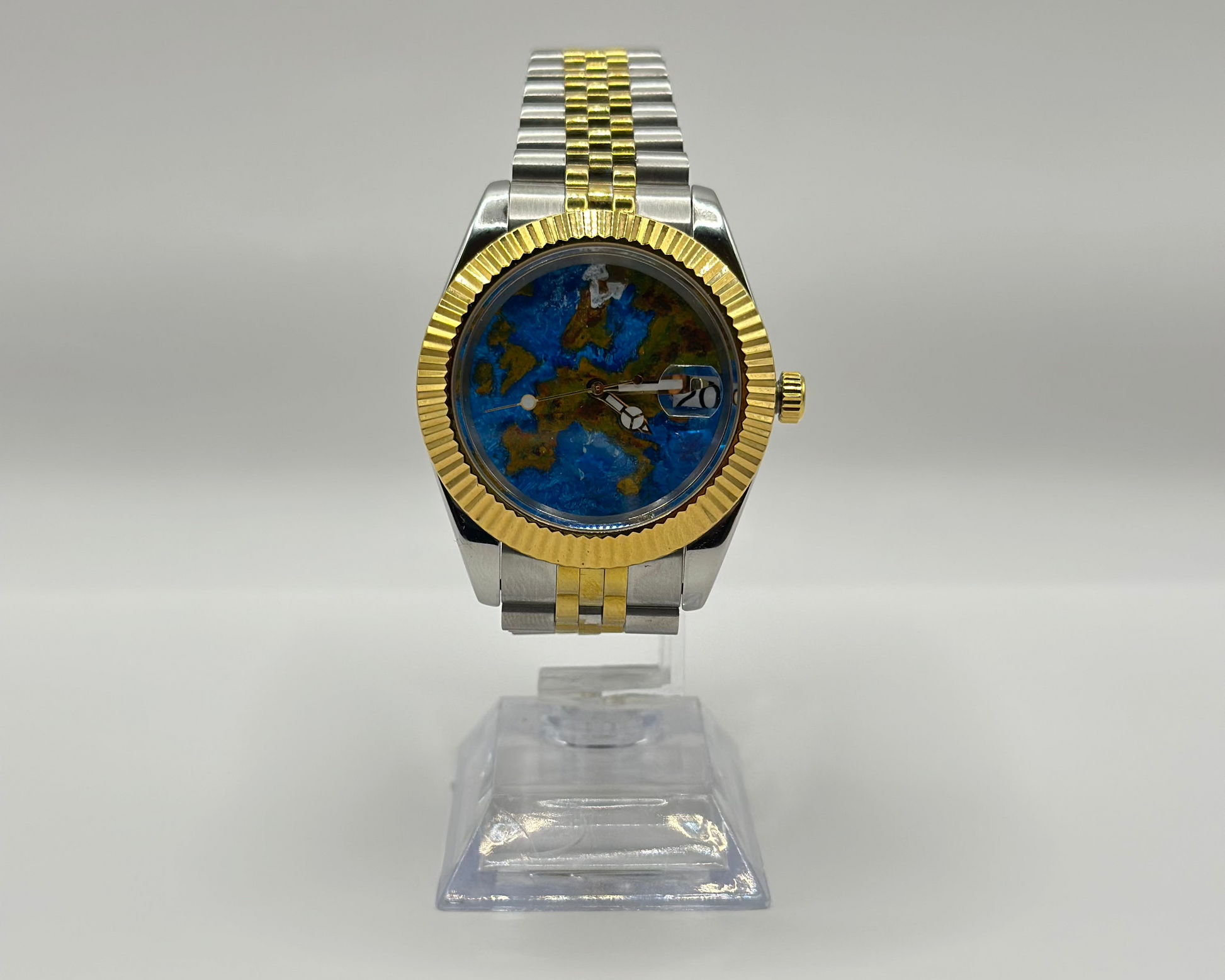 Where heritage meets artistry. The Europe Edition watch presents a stunning hand-painted depiction of the continent, intricately crafted to reflect its rich history and cultural depth. Complemented by a silver and gold case and strap, this watch exudes refinement and sophistication, making it a true statement piece.