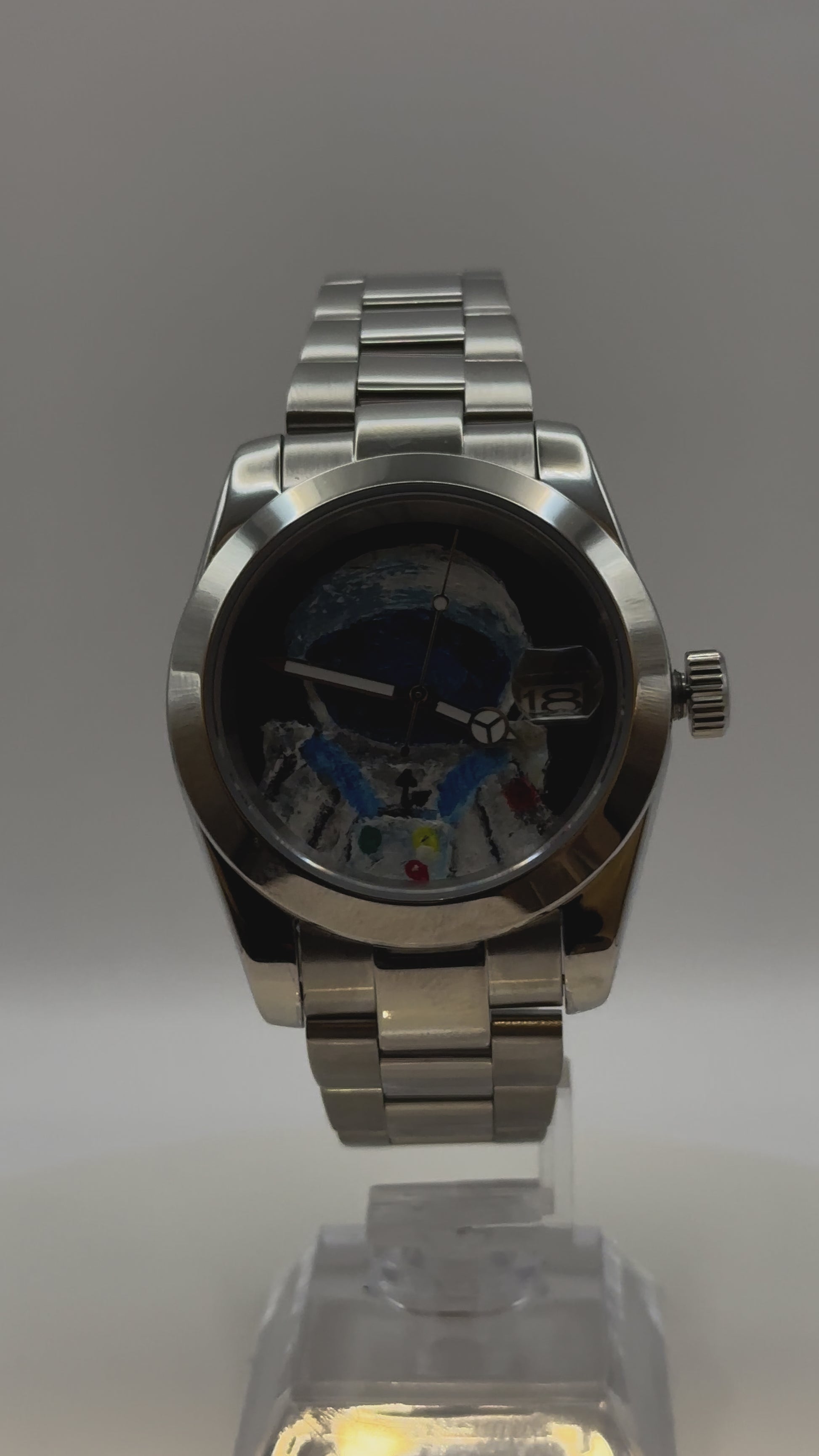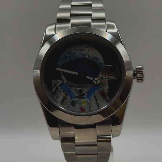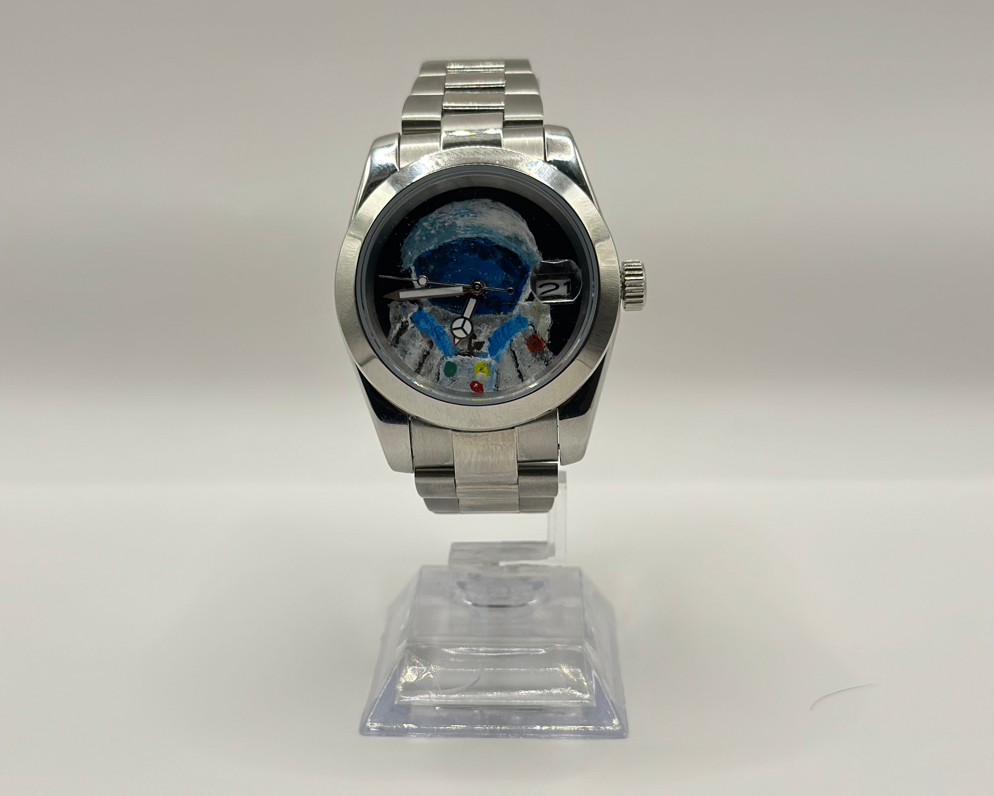 Celebrate humanity's boundless ambition with One Giant Leap. The dial showcases an astronaut's first step on the moon, painted with intricate detail against the lunar surface. This silver-encased masterpiece is a tribute to exploration and the courage to dream beyond our horizons.